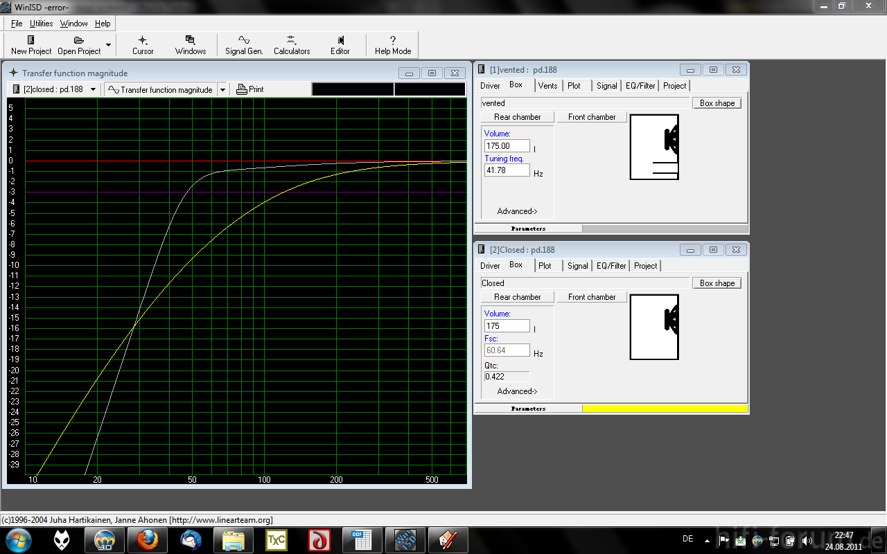 "Klar stimmt Jobst seine Subs so ab, die werden für PA-Treiber genutzt, da diese schon ansich eine hohe Reso haben werden sie auch recht hoch abgestimmt.45Hz BR sieht dann im Vergleich zu CB mit gleichem Volumen so aus:100998Nimmt man jetzt noch realistische..."» Weiterlesen: Sound-Bollerwagen