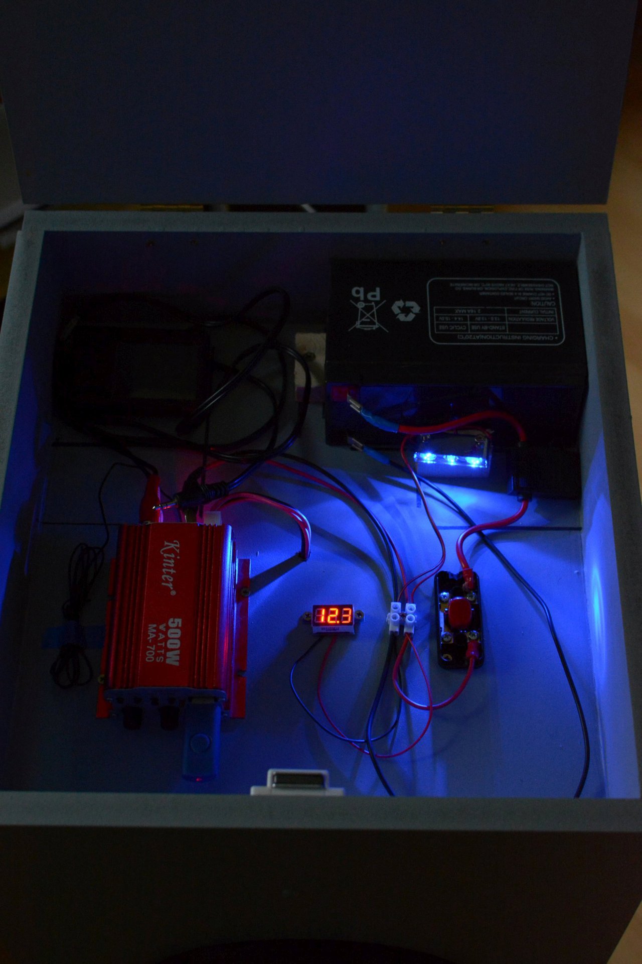 "Sin nombre es "el Ruido".1x Batterie 7,2 Ah1x Sinter MA-7002x Visaton BG20 1x Sackkare1x 3er LED aus alten PC-Modder Zeiten ...fertig ist die Box Gehäuse: 78 x 35 x 38 cm (außen), 15 mm MDF, closed-boxMacht auf jeden Fall Laune und vom Klang..."» Weiterlesen: Bilder von fertigen mobilen Boxen