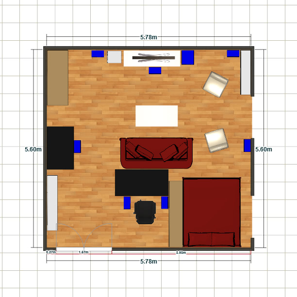 "In Blau hervorgehoben sind die derzeitigen Positionen der Speaker und des Subwoofers (Rear Back Speaker stehen notgedrungen derzeit aber auf der Schreibtischplatte...)