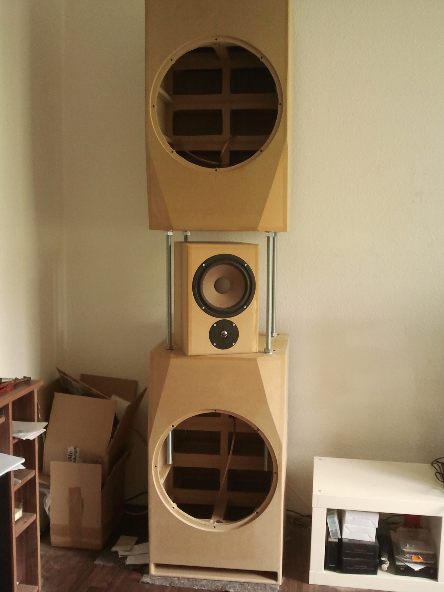 "Der Stahl ist angekommen. Nette 20Kg die sich nochmals auf die Gehäuse verteilen 434478sry für die Handycam, was anderes ist im Moment nicht vorhanden.Mal sehen, wie weit ich heute noch komme.Edit#1:muss noch ein gutes STück nach oben, dass geht aber..."» Weiterlesen: Heimkinoumgestaltung mit Tieftonunterstützung aus 4 18"ern Mivoc AWX 184 und Teufel M200/M100