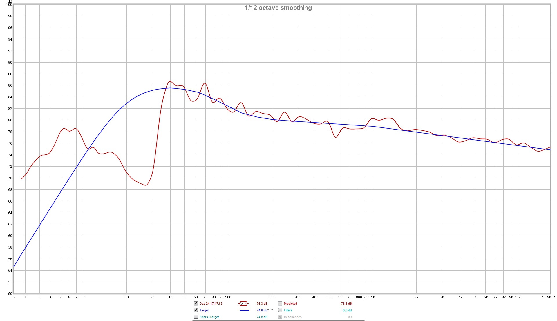 "Nach Anpassung an der Abhörort sieht der Frequenzgang folgendermaßen aus.1134787blau: Zielkurve, rot: Messung"» Weiterlesen: eiBox - ein PC-Lautsprecher mit Omnes Audio BB 3.AL "mit ohne DSP"