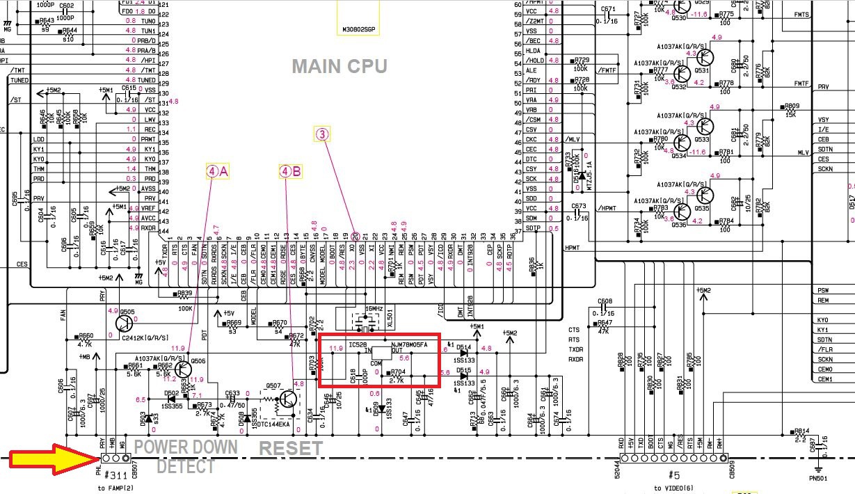 "Hier zur Erläuterung der Schaltplanausschnitt:990218Der Pfeil deutet auf den Steckkontakt hin, der vom Standby-Netzteil kommt. Die 12V werden dort zum Betrieb des Relais genutzt. Hier wird diese Spannung durch den Regler im rot markierten Rechteck gewandelt,..."» Weiterlesen: GELÖST: Yamaha RX-V3800 tot, absolut kein lebenszeichen