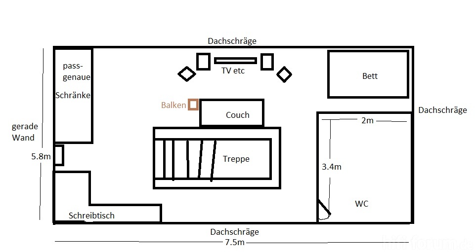"Der Hörraum ist quasi der komplette Dachboden, abzüglich der Ecke unten rechts in welcher sich ein WC befindet. Somit ist eher das WC der abgetrennte Raum Auf der Skizze ist das nicht zu sehen.Ich habe mal grob das Zimmer skizziert:243941Wie hier zu sehen,..."» Weiterlesen: Aufstellung für Surround-Lautsprecher