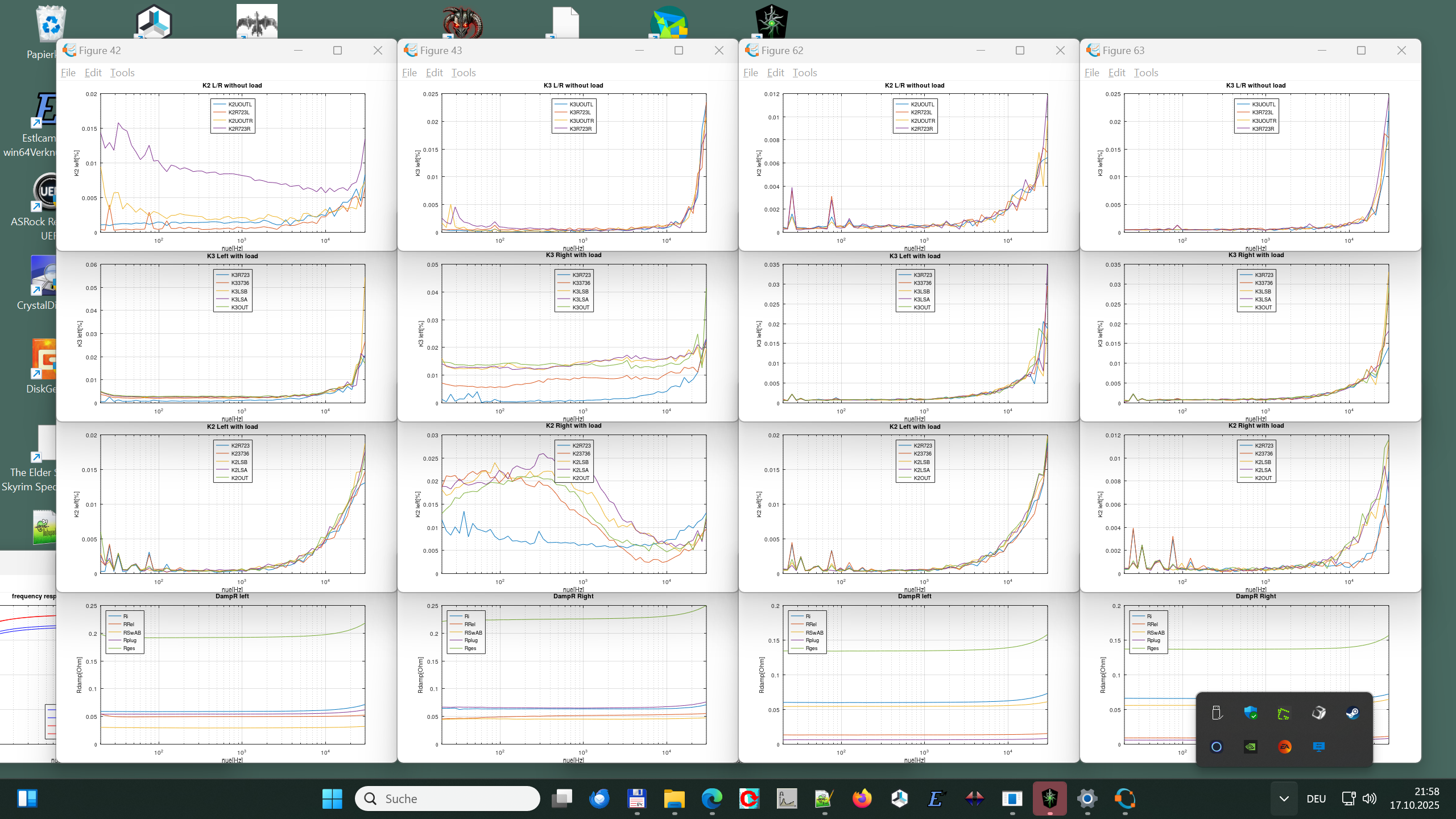 habe fertig: Elkos ausgetauscht Relais ausgetauscht (gegen Schrack 424024) Eingangskondensatoren durch vernünftige ersetzt. Lampen der VU-Meter erneuert Ruhestrom abgeglichen (Hab die - vorher gewickelten - Drainkabel an die Beinchen gelötet Input DC-offset abgeglichen output DC-offset abgeglichen. Die Platine sieht noch sehr gut aus, trotz des größeren Alters, erscheint die mir wesentlich besser, als die Platinen in den Grundigs (V5000, etc). Andere Verstärker aus der Zeit habe ich noch nie repariert. Klirr und Damping sehen aus meiner Sicht gut aus. der Lautsprecher (A,B,A+B) Schalter könnte noch ne Reinigung vertragen, aber da gehe ich nicht wirklich dran. Die Plots sind links: Vorher Messung, rechts: nachher Messung Damping: Ri: Innenwiderstand der Endstufe RRel: Widerstand des Relais -> Deutlich besser geworden! Was man hier nicht sieht, ist der Effekt, den ich gesehen habe, wenn ich gegen das alte Relais geklopft habe ... vorher: sämtlich Kn bis K10 vorhanden und gut sichtbar nach Klopfen: Ausschließlich K2 und K3 ... auf extrem niedrigem Niveau nach 5-10 Messungen, wieder genau wie vor dem Klopfen RSwAB: A,B,A+B Ausgangsschalter ... Ja da geht das Signal direkt drüber :-( Rplug: Widerstand des Steckers, da hatte ich bei der ersten Messung 6mm Strippen, die ich nicht wirklich in die Ausgangsbuchsen geklemmt bekommen habe, das war bei der 2. Messung deutlich besser (versilberte 2.5mm Kabel) Bild hochladen funktioniert bei mir nicht, hab das bei mir hochgeladen: https://www.uwedamm...._58_02-Greenshot.png |