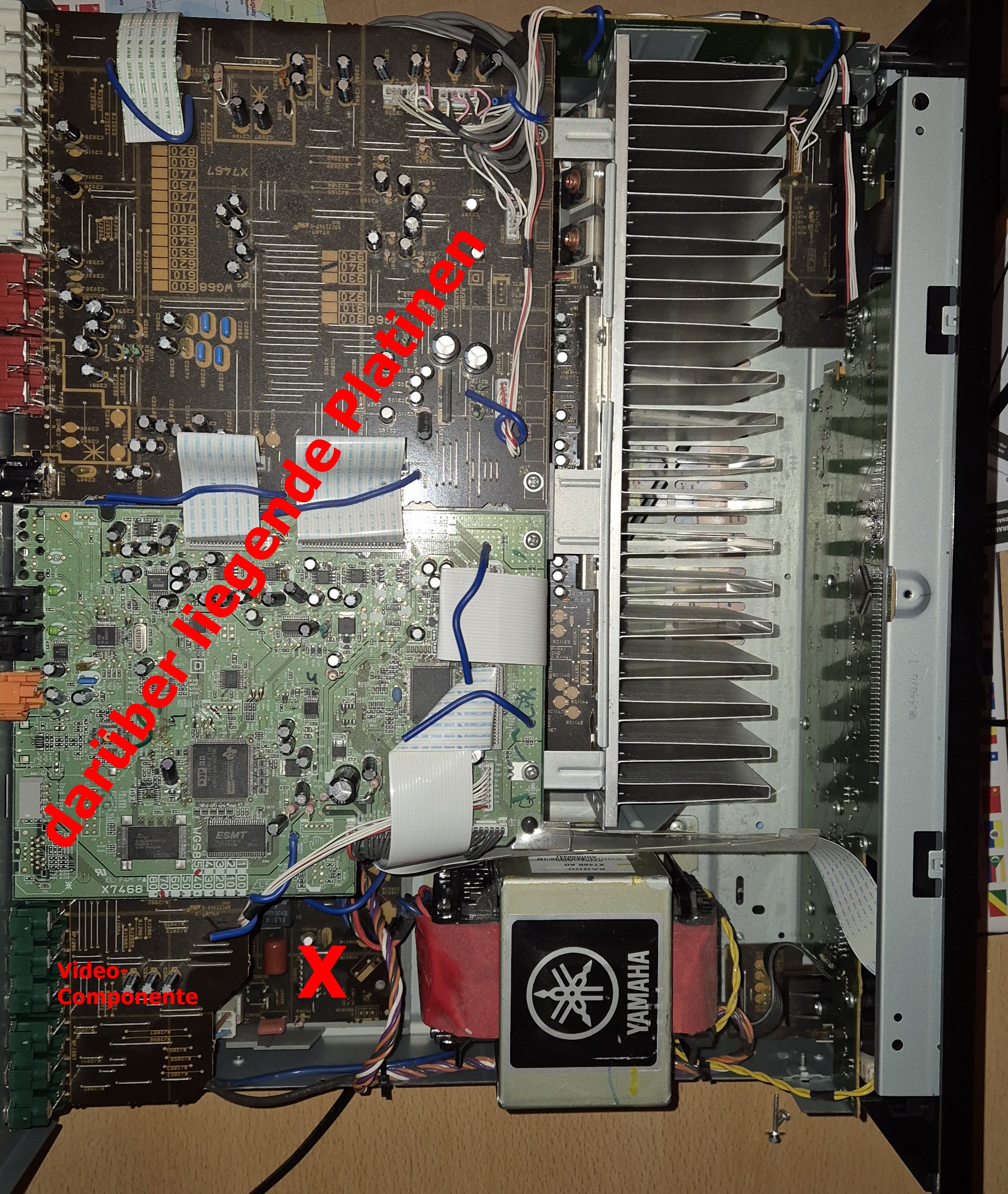 Guten Tag, vorweg: ich habe keine Anhnung vom Umgang mit elektrischen Bauteilen, bin jedoch ein Bastler und sehr neugierig. Der Receiver läßt sich nicht einschalten. Es ist weder das Display sichtbar, noch ein Klicken ist zu hören. Im Netz habe ich einige Videos gefunden (leider keines von meinem Modell), wo beschrieben wird, wie man einen Kondensator wechselt (ich nehme an, dass dieser der Grund für das Problem ist). In den gezeigten Videos ist die dafür vorgesehene Platine ganz einfach herauszunehmen, was bei meinem Receiver nicht der Fall ist. Sie befindet sich ganz unten (siehe Markierung "X" im Anhang) Innenansicht YAMAHA RX V-459. Darüber liegt aber teilweise die für die Video Componentee und darüber wiederum zwei größere Platinen. Ich habe die Schrauben bei der untersten Platine bereits gelöst und sie läßt sich bewegen, jedoch kann ich sie nicht herausziehen. Ist es wirklich notwendig, zumindest die Platine für die Video Componente herauszunehmen? Diese ist aber wieder unter den anderen beiden Platinen angebracht und läßt sich trotz Lösen der Schrauben nicht herausnehmen. D. h. auch die darüber liegenden Platinen müßten entfernt werden. Wenn dem so ist, kann ich es vergessen, da ich die Befürchtung habe, dass ich dabei irgendwelche Teile beschädigen könnte.Gruß Erich |
